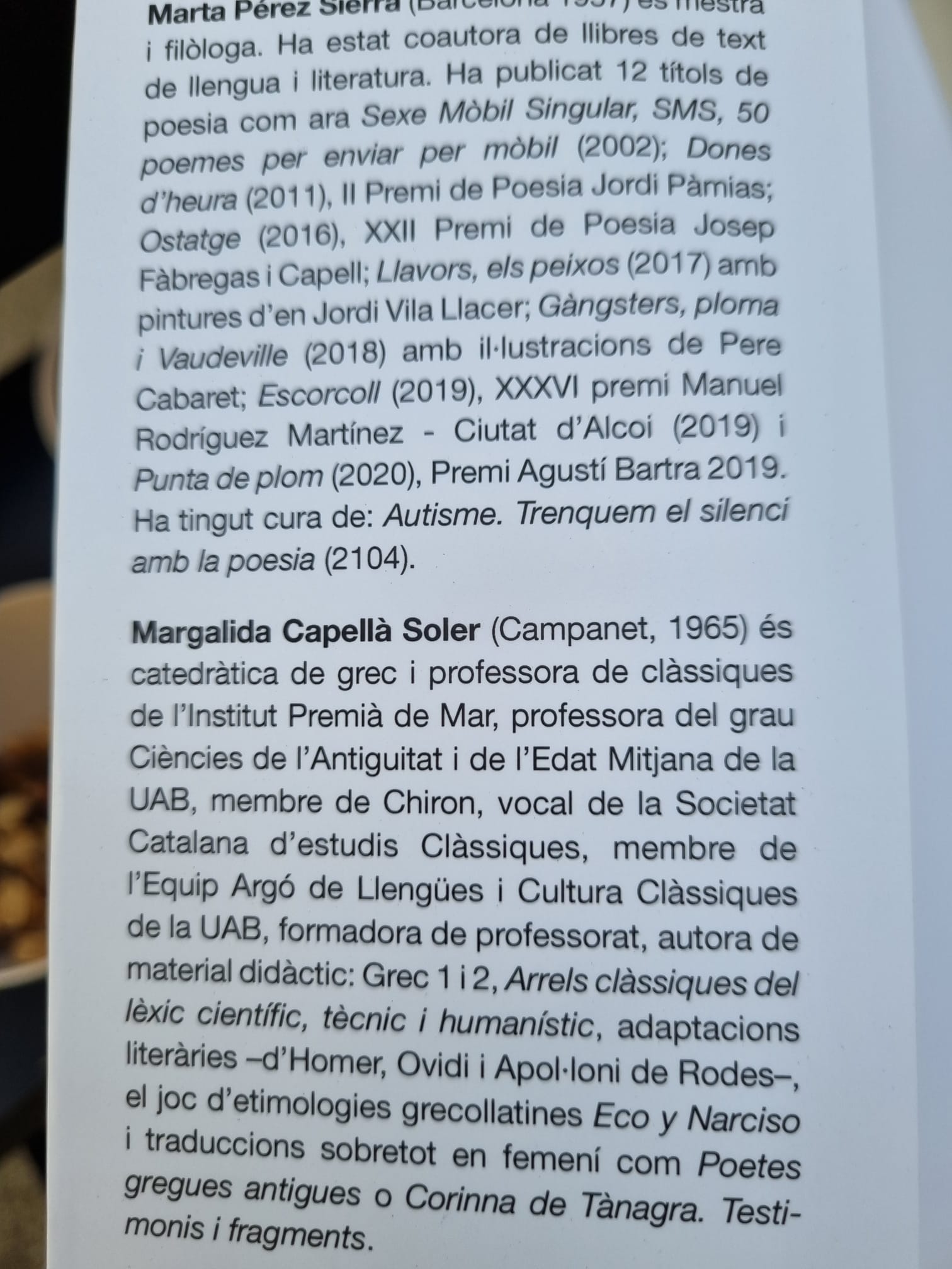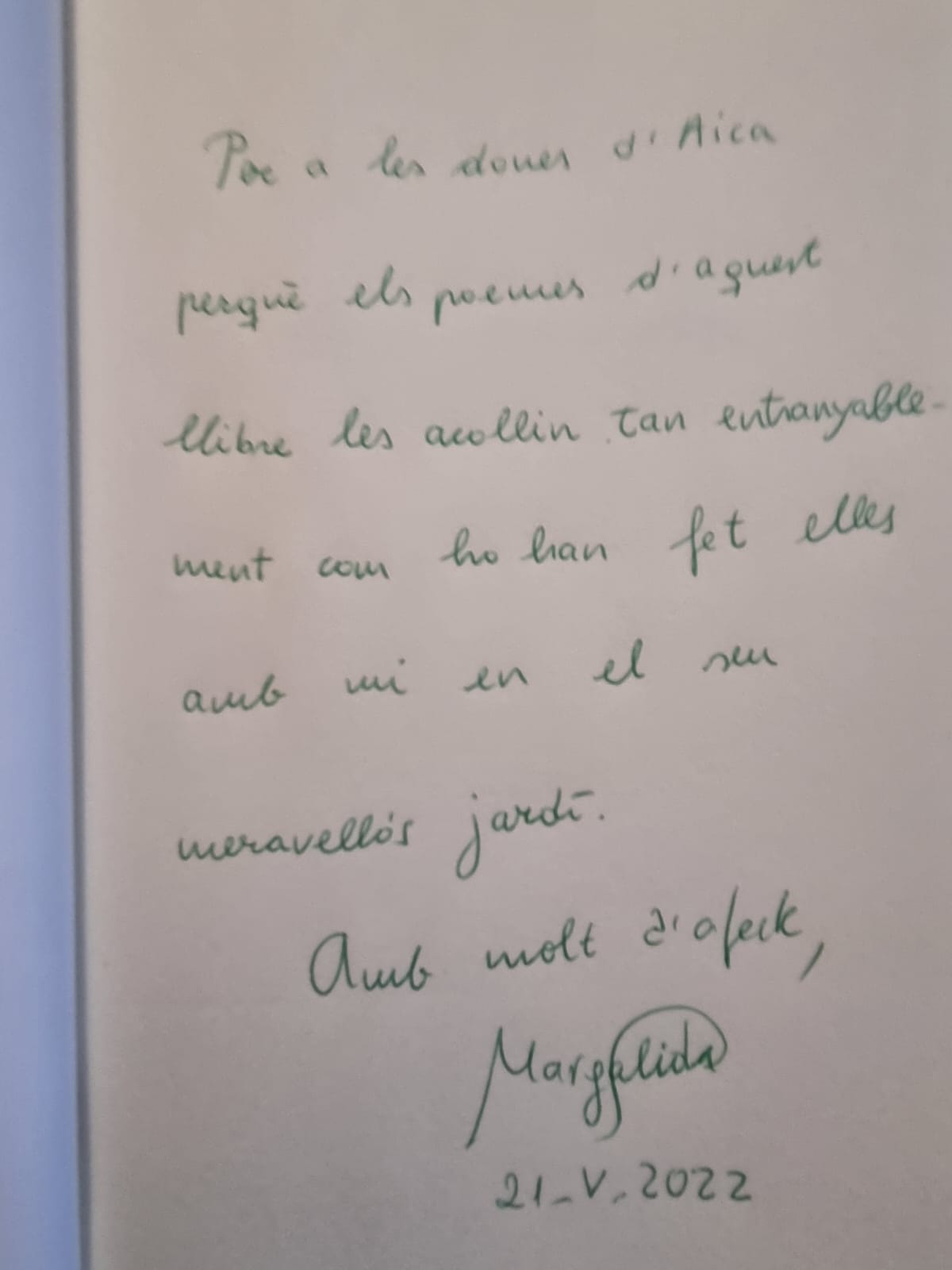 Ens va transportar a un món de dones, Grècia, alumnes, arbres i poesia… Les fotos, el llibre, la dedicatòria, el vídeo de Sant Jordi… res no es suficient per explicar el que va ser l’estança de la Margalida: una caçadora de la bellesa i artesana d’emocions. Però prenem nota, les arbres són femenins, sin pensem perquè diem: la llimona, la taronja, la figa, la cirera…?